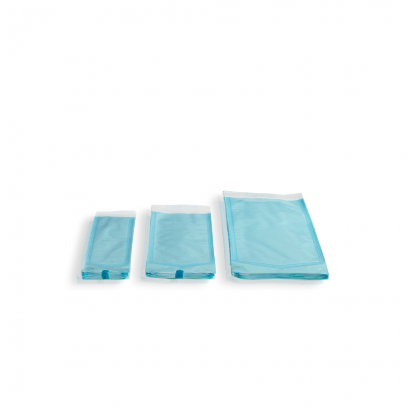 Buste auto sigillanti in carta medicale bianca ad elevata grammatura (60g/m²) e doppio strato di film azzurro in polietilene/polipropilene. Offrono una tenuta costante in fase di sterilizzazione e mantengono la sterilità fino a 6 mesi in condizioni di stoccaggio idonee.