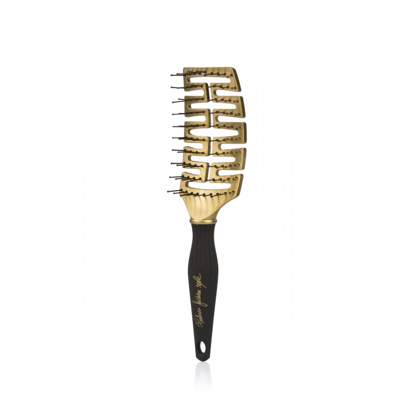 Spazzola ventilata dalla forma ergonomica studiata per adattarsi perfettamente alla forma della testa, scivolando facilmente e districando i capelli senza stressarli.