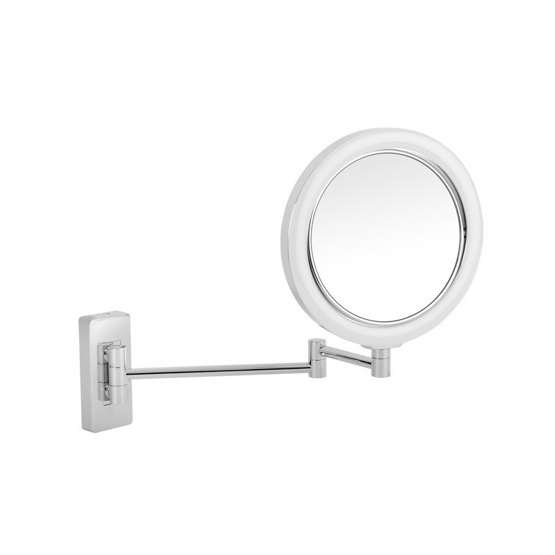 Specchio doppio girevole da parete, con struttura in ABS, finiture cromate e braccio estensibile. Si ripiega completamente contro il muro.